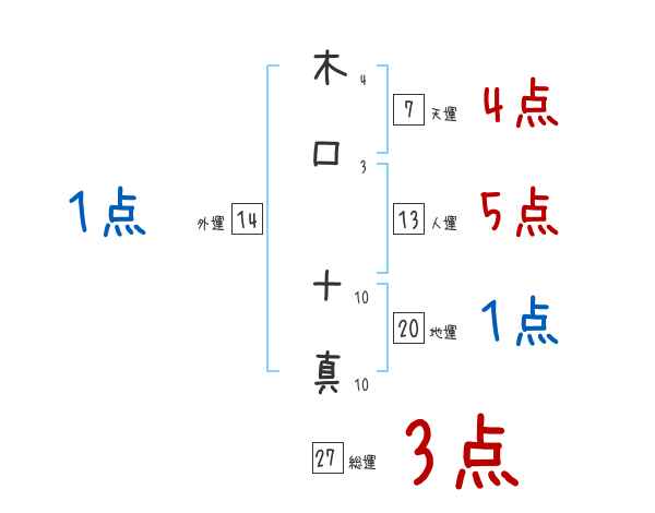 外運![]() | 木口十真さんの外運は14画の1つ星!人に対して優しいがストレスを溜め込みがち。人間関係のトラブルを避けるよう気をつけましょう。 生活面を象徴する運勢です。外部から受ける影響力を表し、結婚運、家庭運や職場、環境への順応性を表します。 |