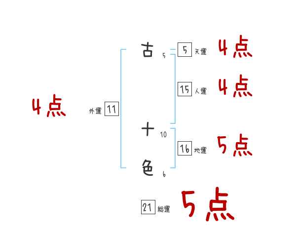 天運![]() | 古十色さんの天運は5画の4つ星!健康で安泰。協調性に優れ、財産に恵まれる。 家系が持つ宿命的な運勢を表します。祖先から受け継いだ苗字ですので自分の力が及びません。家柄を象徴します。 |