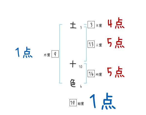 外運![]() | 土十色さんの外運は9画の1つ星!消極的で才能を発揮することが苦手なことも。周りの意見に耳を傾けましょう。 生活面を象徴する運勢です。外部から受ける影響力を表し、結婚運、家庭運や職場、環境への順応性を表します。 |