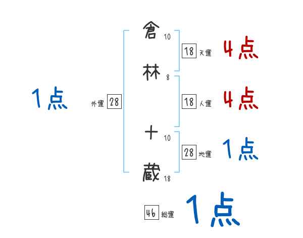 天運![]() | 倉林十蔵さんの天運は18画の4つ星!情熱的で剛気。忍耐力があり信頼される。 家系が持つ宿命的な運勢を表します。祖先から受け継いだ苗字ですので自分の力が及びません。家柄を象徴します。 |
