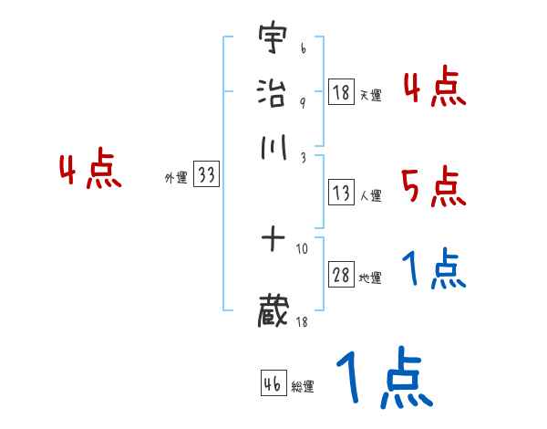 天運![]() | 宇治川十蔵さんの天運は18画の4つ星!情熱的で剛気。忍耐力があり信頼される。 家系が持つ宿命的な運勢を表します。祖先から受け継いだ苗字ですので自分の力が及びません。家柄を象徴します。 |