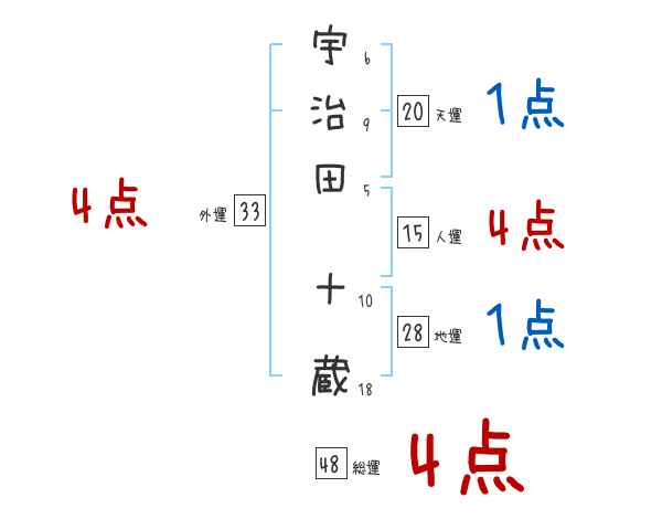 総運![]() | 宇治田十蔵さんの総運は48画の4つ星!賢明な性格で人望が厚い。指導力があり多くの人に尊敬される。 あなたの人生を表す1番重要な運勢です。生涯を通じて影響する総合運となり、主に50歳以降の晩年期に影響を及ぼします。 |