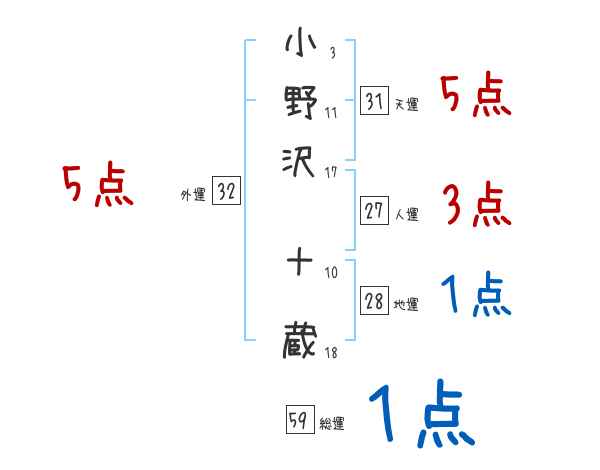 外運![]() | 小野沢十蔵さんの外運は32画の5つ星!柔軟性があり成功する。チャンスが多く金運が良い。 生活面を象徴する運勢です。外部から受ける影響力を表し、結婚運、家庭運や職場、環境への順応性を表します。 |