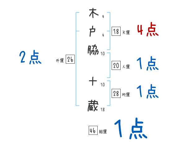 地運![]() | 木戸脇十蔵さんの地運は28画の1つ星!家庭環境に注意。スポーツで活躍できる能力があるかも。 個性を表す基礎的な運勢です。性格形成や対人関係、行動力など家庭環境に影響されます。主に誕生してから20歳くらいまでの若年期の運勢を表します。 |