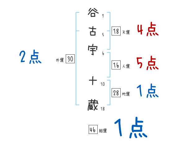 天運![]() | 谷古宇十蔵さんの天運は18画の4つ星!情熱的で剛気。忍耐力があり信頼される。 家系が持つ宿命的な運勢を表します。祖先から受け継いだ苗字ですので自分の力が及びません。家柄を象徴します。 |