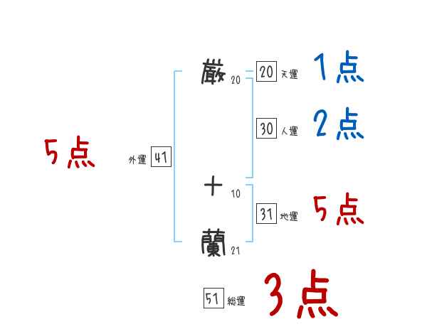 総運![]() | 厳十蘭さんの総運は51画の3つ星!変化が激しく、危険に注意。堅実な性格。 あなたの人生を表す1番重要な運勢です。生涯を通じて影響する総合運となり、主に50歳以降の晩年期に影響を及ぼします。 |