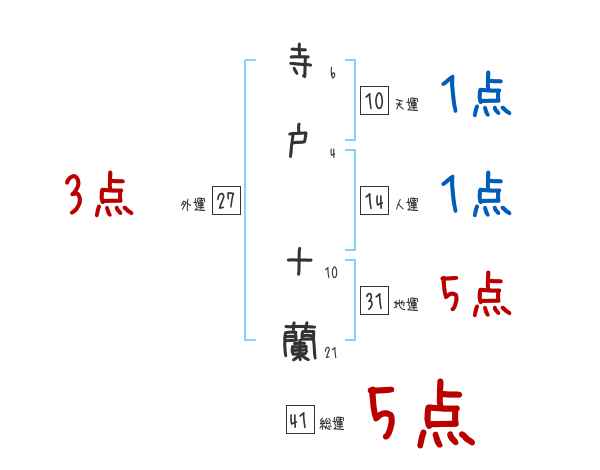 外運![]() | 寺戸十蘭さんの外運は27画の3つ星!頭脳明晰だが強情で摩擦が多い傾向。孤立に注意。 生活面を象徴する運勢です。外部から受ける影響力を表し、結婚運、家庭運や職場、環境への順応性を表します。 |