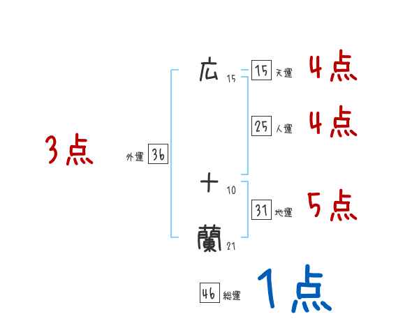 総運![]() | 広十蘭さんの総運は46画の1つ星!迷走することが多く苦労するかも。目先のことにとらわれないように。 あなたの人生を表す1番重要な運勢です。生涯を通じて影響する総合運となり、主に50歳以降の晩年期に影響を及ぼします。 |