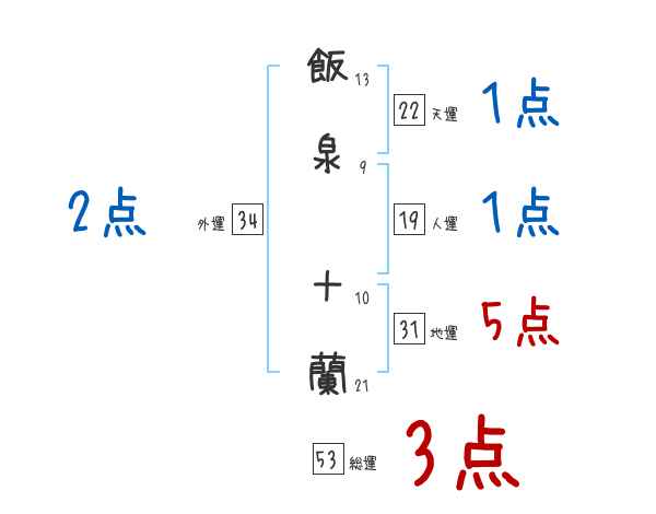 総運![]() | 飯泉十蘭さんの総運は53画の3つ星!やや見栄っ張りで虚栄心がある。散財に注意。 あなたの人生を表す1番重要な運勢です。生涯を通じて影響する総合運となり、主に50歳以降の晩年期に影響を及ぼします。 |