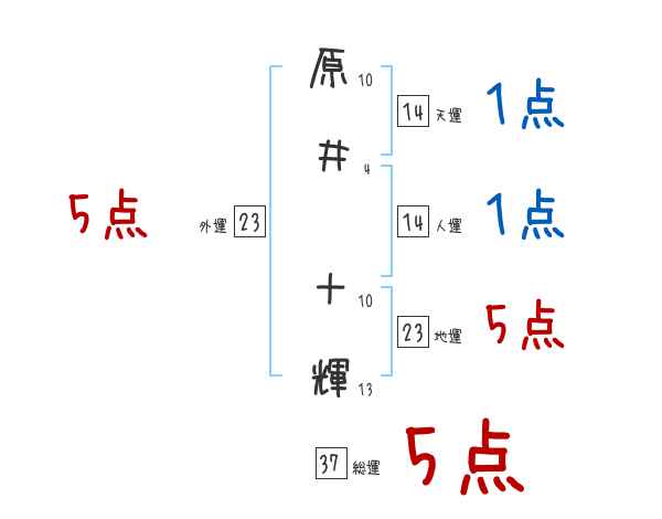 外運![]() | 原井十輝さんの外運は23画の5つ星!想像力に優れ活力がある。一代で成功し名誉を手に入れる。 生活面を象徴する運勢です。外部から受ける影響力を表し、結婚運、家庭運や職場、環境への順応性を表します。 |