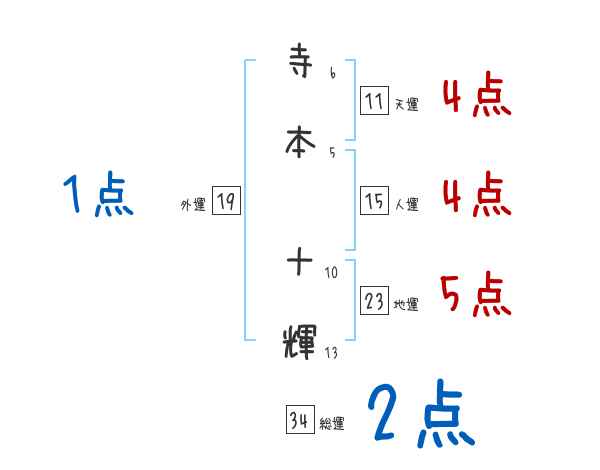天運![]() | 寺本十輝さんの天運は11画の4つ星!着実に富や地位を得る幸運な人生。 家系が持つ宿命的な運勢を表します。祖先から受け継いだ苗字ですので自分の力が及びません。家柄を象徴します。 |