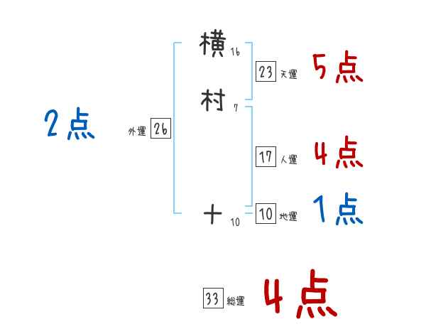 天運![]() | 横村十さんの天運は23画の5つ星!想像力に優れ活力がある。一代で成功し名誉を手に入れる。 家系が持つ宿命的な運勢を表します。祖先から受け継いだ苗字ですので自分の力が及びません。家柄を象徴します。 |