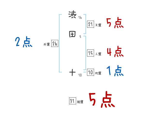 天運![]() | 渋田十さんの天運は21画の5つ星!統率力がある。独立し成功する。名誉を手に入れる。 家系が持つ宿命的な運勢を表します。祖先から受け継いだ苗字ですので自分の力が及びません。家柄を象徴します。 |