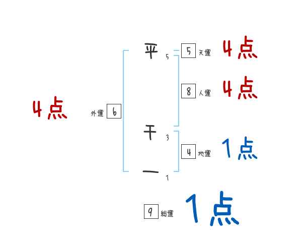 人運![]() | 平千一さんの人運は8画の4つ星!勤勉家。根気強く努力し成功する。忍耐力がある。 性格や才能などを表す2番目に重要な運勢です。人間関係や協調性、社会的な成功に影響します。主に20歳から50歳ぐらいまでの中年期の運勢を表します。 |
