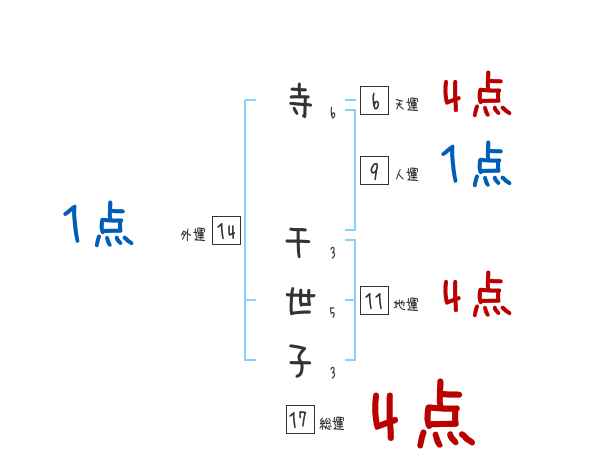 外運![]() | 寺千世子さんの外運は14画の1つ星!人に対して優しいがストレスを溜め込みがち。人間関係のトラブルを避けるよう気をつけましょう。 生活面を象徴する運勢です。外部から受ける影響力を表し、結婚運、家庭運や職場、環境への順応性を表します。 |