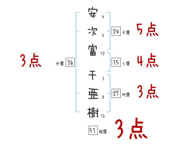 天運![]() | 安次富千亜樹さんの天運は24画の5つ星!家庭運が良く順調な人生。金運にも恵まれる。 家系が持つ宿命的な運勢を表します。祖先から受け継いだ苗字ですので自分の力が及びません。家柄を象徴します。 |