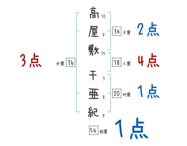 外運![]() | 高屋敷千亜紀さんの外運は36画の3つ星!先見性が豊かです。多少神経質で苦労することも。 生活面を象徴する運勢です。外部から受ける影響力を表し、結婚運、家庭運や職場、環境への順応性を表します。 |