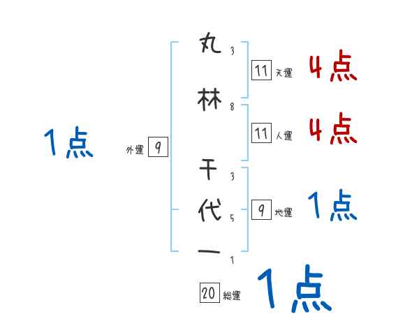 天運![]() | 丸林千代一さんの天運は11画の4つ星!着実に富や地位を得る幸運な人生。 家系が持つ宿命的な運勢を表します。祖先から受け継いだ苗字ですので自分の力が及びません。家柄を象徴します。 |