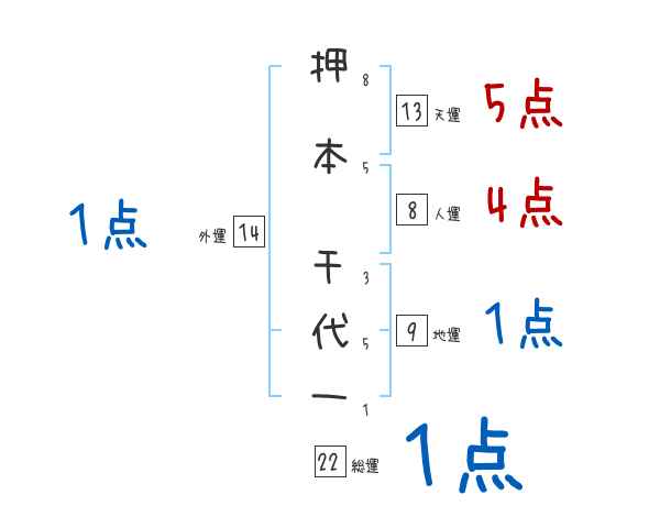 外運![]() | 押本千代一さんの外運は14画の1つ星!人に対して優しいがストレスを溜め込みがち。人間関係のトラブルを避けるよう気をつけましょう。 生活面を象徴する運勢です。外部から受ける影響力を表し、結婚運、家庭運や職場、環境への順応性を表します。 |