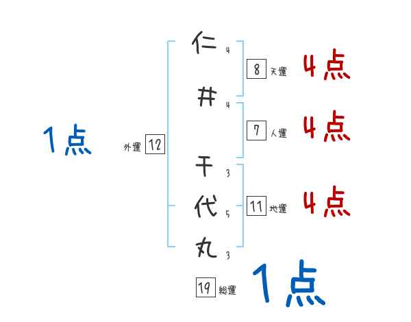 天運![]() | 仁井千代丸さんの天運は8画の4つ星!勤勉家。根気強く努力し成功する。忍耐力がある。 家系が持つ宿命的な運勢を表します。祖先から受け継いだ苗字ですので自分の力が及びません。家柄を象徴します。 |
