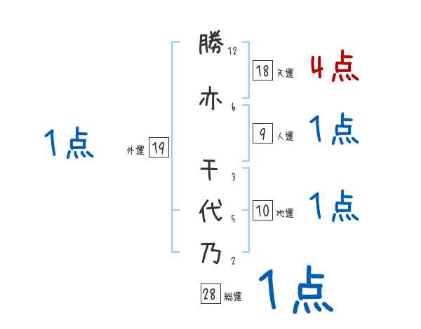 天運![]() | 勝亦千代乃さんの天運は18画の4つ星!情熱的で剛気。忍耐力があり信頼される。 家系が持つ宿命的な運勢を表します。祖先から受け継いだ苗字ですので自分の力が及びません。家柄を象徴します。 |