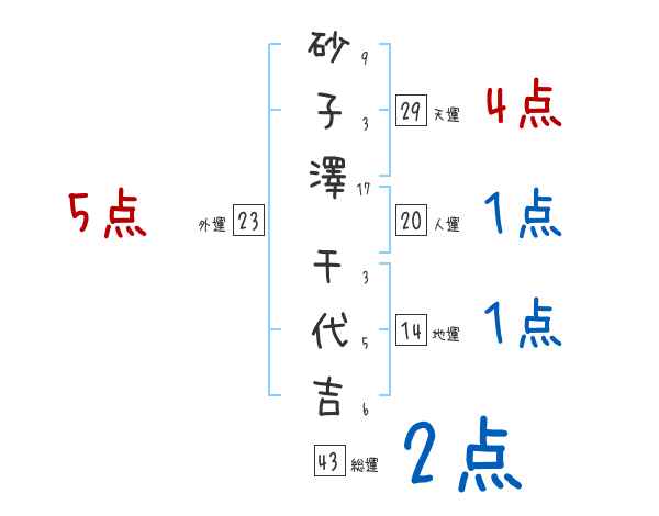 外運![]() | 砂子澤千代吉さんの外運は23画の5つ星!想像力に優れ活力がある。一代で成功し名誉を手に入れる。 生活面を象徴する運勢です。外部から受ける影響力を表し、結婚運、家庭運や職場、環境への順応性を表します。 |