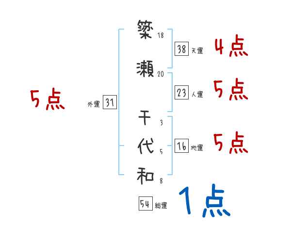 総運![]() | 簗瀬千代和さんの総運は54画の1つ星!トラブルが多いかも。周りをよく見て協調して過ごしましょう。 あなたの人生を表す1番重要な運勢です。生涯を通じて影響する総合運となり、主に50歳以降の晩年期に影響を及ぼします。 |