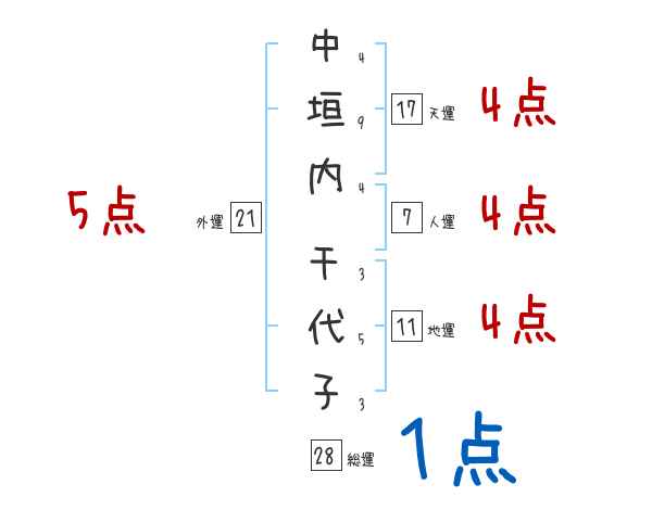 人運![]() | 中垣内千代子さんの人運は7画の4つ星!強い意志や信念を持ち独立心が強い。自立する。 性格や才能などを表す2番目に重要な運勢です。人間関係や協調性、社会的な成功に影響します。主に20歳から50歳ぐらいまでの中年期の運勢を表します。 |