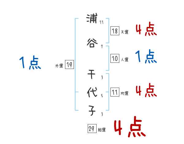 外運![]() | 浦谷千代子さんの外運は19画の1つ星!優れた才能を持ちますが、協調性が足りないことも。周りの人と協力する事を意識しましょう。 生活面を象徴する運勢です。外部から受ける影響力を表し、結婚運、家庭運や職場、環境への順応性を表します。 |