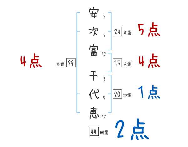 天運![]() | 安次富千代恵さんの天運は24画の5つ星!家庭運が良く順調な人生。金運にも恵まれる。 家系が持つ宿命的な運勢を表します。祖先から受け継いだ苗字ですので自分の力が及びません。家柄を象徴します。 |