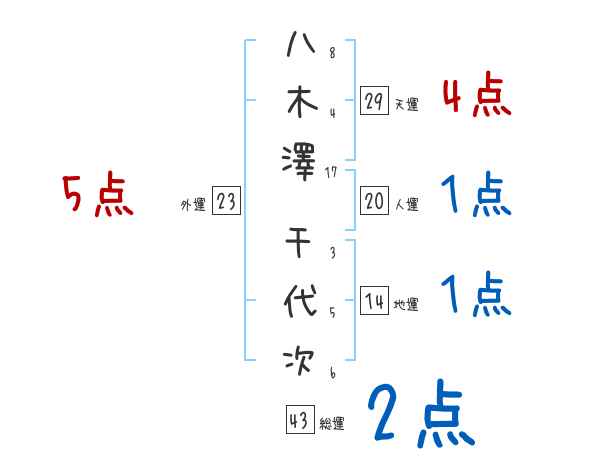 外運![]() | 八木澤千代次さんの外運は23画の5つ星!想像力に優れ活力がある。一代で成功し名誉を手に入れる。 生活面を象徴する運勢です。外部から受ける影響力を表し、結婚運、家庭運や職場、環境への順応性を表します。 |