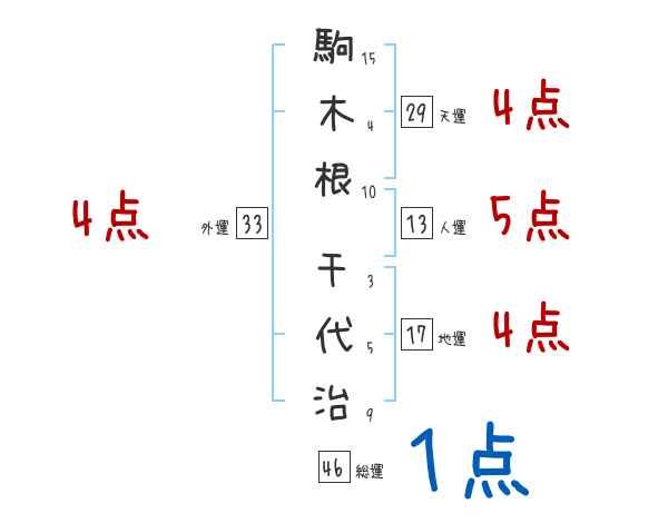 外運![]() | 駒木根千代治さんの外運は33画の4つ星!権力志向でプライドが高い。勇気があり運を切り開き成功する。 生活面を象徴する運勢です。外部から受ける影響力を表し、結婚運、家庭運や職場、環境への順応性を表します。 |