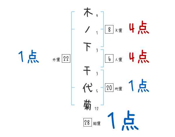 総運![]() | 木ノ下千代菊さんの総運は28画の1つ星!家庭環境に注意。スポーツで活躍できる能力があるかも。 あなたの人生を表す1番重要な運勢です。生涯を通じて影響する総合運となり、主に50歳以降の晩年期に影響を及ぼします。 |