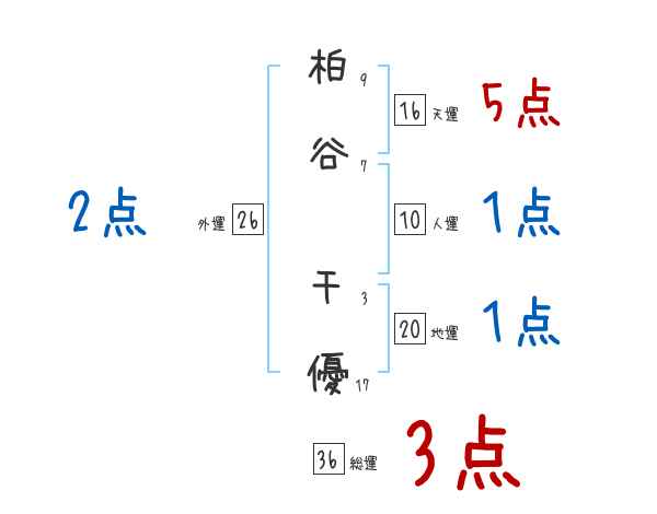 外運![]() | 柏谷千優さんの外運は26画の2つ星!波瀾万丈かも。信頼できる人を大事にしましょう。 生活面を象徴する運勢です。外部から受ける影響力を表し、結婚運、家庭運や職場、環境への順応性を表します。 |