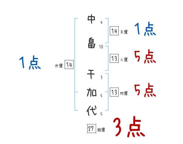 天運![]() | 中畠千加代さんの天運は14画の1つ星!人に対して優しいがストレスを溜め込みがち。人間関係のトラブルを避けるよう気をつけましょう。 家系が持つ宿命的な運勢を表します。祖先から受け継いだ苗字ですので自分の力が及びません。家柄を象徴します。 |