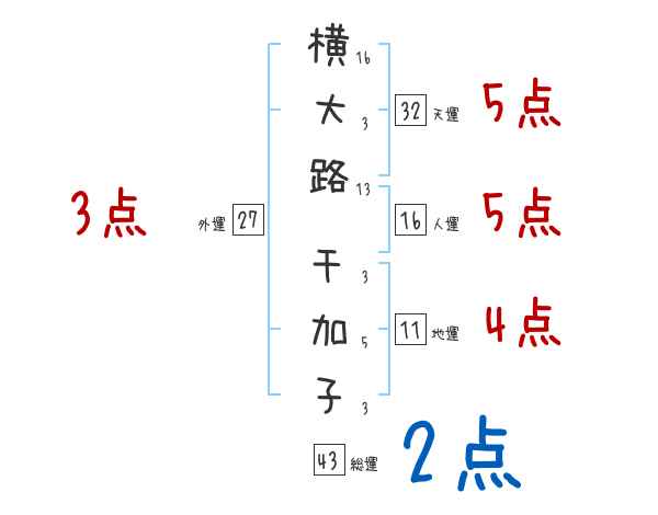 天運![]() | 横大路千加子さんの天運は32画の5つ星!柔軟性があり成功する。チャンスが多く金運が良い。 家系が持つ宿命的な運勢を表します。祖先から受け継いだ苗字ですので自分の力が及びません。家柄を象徴します。 |