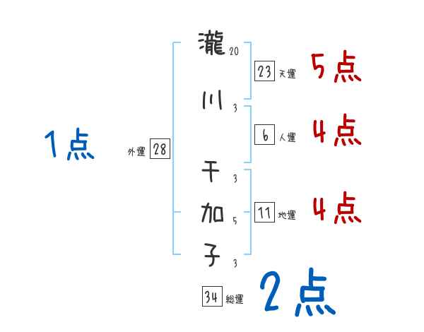 総運![]() | 瀧川千加子さんの総運は34画の2つ星!独創性に優れるが、自尊心が強く災難に注意しましょう。 あなたの人生を表す1番重要な運勢です。生涯を通じて影響する総合運となり、主に50歳以降の晩年期に影響を及ぼします。 |