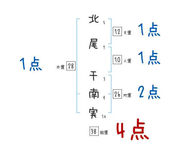 天運![]() | 北尾千南実さんの天運は12画の1つ星!簡単な失敗で諦めてしまいやすいかも。着実に行動すると良いでしょう。 家系が持つ宿命的な運勢を表します。祖先から受け継いだ苗字ですので自分の力が及びません。家柄を象徴します。 |