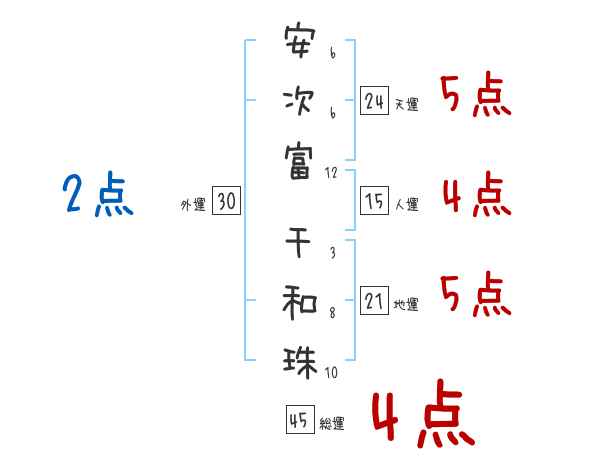 天運![]() | 安次富千和珠さんの天運は24画の5つ星!家庭運が良く順調な人生。金運にも恵まれる。 家系が持つ宿命的な運勢を表します。祖先から受け継いだ苗字ですので自分の力が及びません。家柄を象徴します。 |
