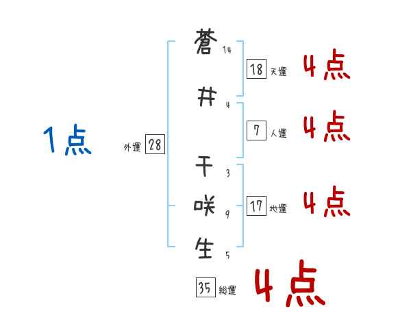 天運![]() | 蒼井千咲生さんの天運は18画の4つ星!情熱的で剛気。忍耐力があり信頼される。 家系が持つ宿命的な運勢を表します。祖先から受け継いだ苗字ですので自分の力が及びません。家柄を象徴します。 |