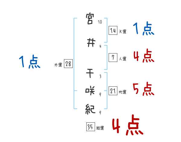 外運![]() | 宮井千咲紀さんの外運は28画の1つ星!家庭環境に注意。スポーツで活躍できる能力があるかも。 生活面を象徴する運勢です。外部から受ける影響力を表し、結婚運、家庭運や職場、環境への順応性を表します。 |