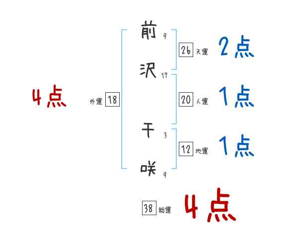 外運![]() | 前沢千咲さんの外運は18画の4つ星!情熱的で剛気。忍耐力があり信頼される。 生活面を象徴する運勢です。外部から受ける影響力を表し、結婚運、家庭運や職場、環境への順応性を表します。 |