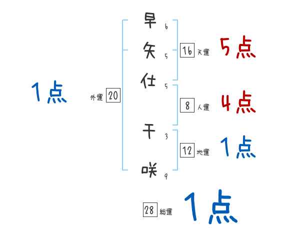 総運![]() | 早矢仕千咲さんの総運は28画の1つ星!家庭環境に注意。スポーツで活躍できる能力があるかも。 あなたの人生を表す1番重要な運勢です。生涯を通じて影響する総合運となり、主に50歳以降の晩年期に影響を及ぼします。 |