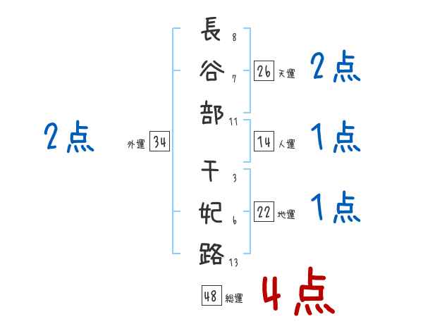 天運![]() | 長谷部千妃路さんの天運は26画の2つ星!波瀾万丈かも。信頼できる人を大事にしましょう。 家系が持つ宿命的な運勢を表します。祖先から受け継いだ苗字ですので自分の力が及びません。家柄を象徴します。 |