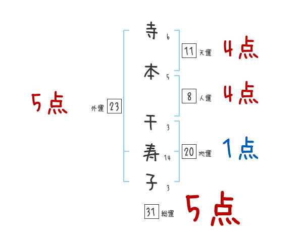 天運![]() | 寺本千寿子さんの天運は11画の4つ星!着実に富や地位を得る幸運な人生。 家系が持つ宿命的な運勢を表します。祖先から受け継いだ苗字ですので自分の力が及びません。家柄を象徴します。 |