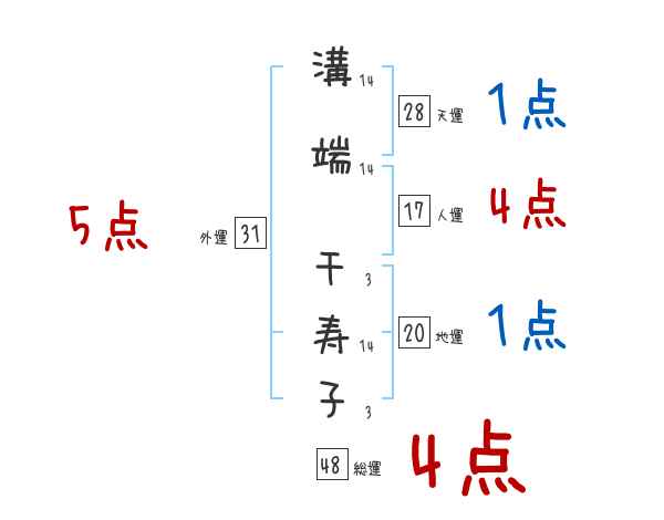 天運![]() | 溝端千寿子さんの天運は28画の1つ星!家庭環境に注意。スポーツで活躍できる能力があるかも。 家系が持つ宿命的な運勢を表します。祖先から受け継いだ苗字ですので自分の力が及びません。家柄を象徴します。 |