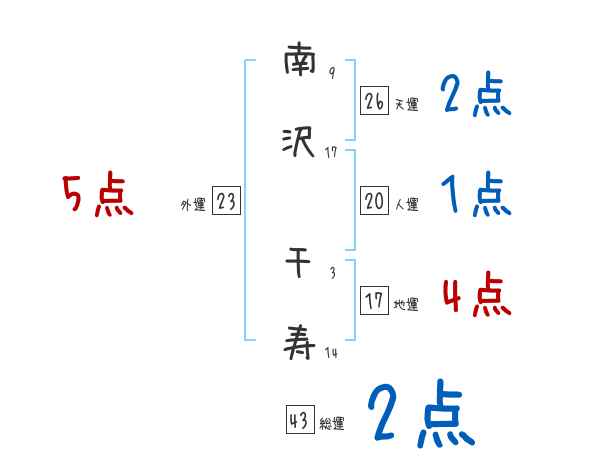 外運![]() | 南沢千寿さんの外運は23画の5つ星!想像力に優れ活力がある。一代で成功し名誉を手に入れる。 生活面を象徴する運勢です。外部から受ける影響力を表し、結婚運、家庭運や職場、環境への順応性を表します。 |