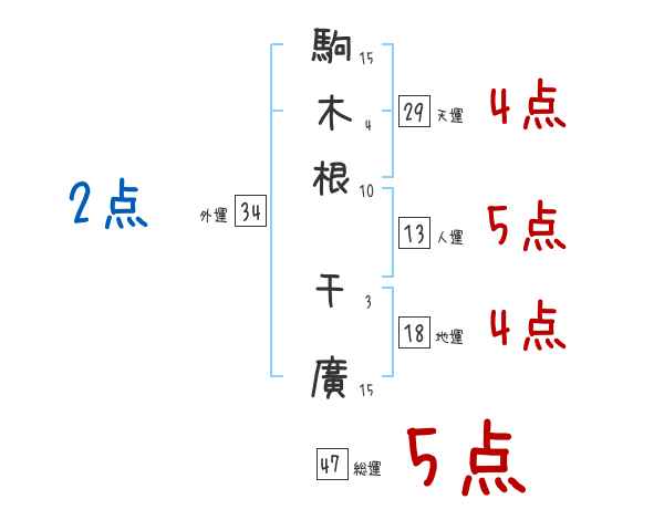 総運![]() | 駒木根千廣さんの総運は47画の5つ星!実力が開花し発展する円満な人生。財に恵まれる。 あなたの人生を表す1番重要な運勢です。生涯を通じて影響する総合運となり、主に50歳以降の晩年期に影響を及ぼします。 |