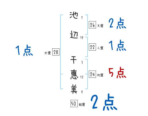 人運![]() | 池辺千惠美さんの人運は22画の1つ星!努力することが苦手ないっぽう手先が器用。芸術性にも優れる。 性格や才能などを表す2番目に重要な運勢です。人間関係や協調性、社会的な成功に影響します。主に20歳から50歳ぐらいまでの中年期の運勢を表します。 |
