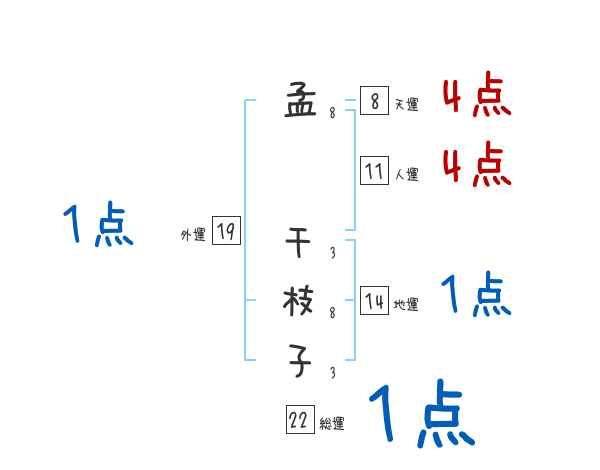 総運![]() | 孟千枝子さんの総運は22画の1つ星!努力することが苦手ないっぽう手先が器用。芸術性にも優れる。 あなたの人生を表す1番重要な運勢です。生涯を通じて影響する総合運となり、主に50歳以降の晩年期に影響を及ぼします。 |